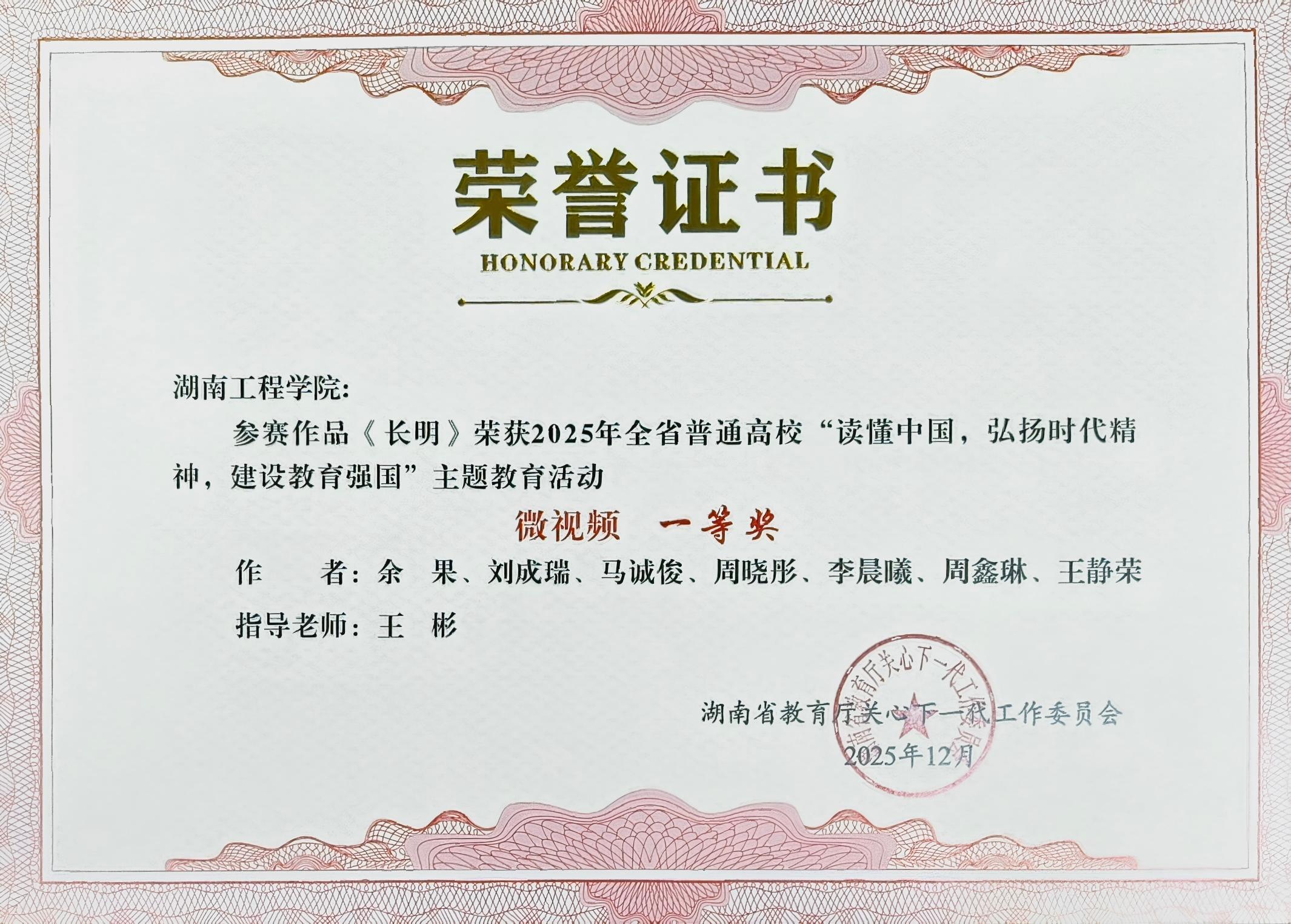 近日,湖南省教育厅关工委公布了2025年度"读懂中国"主题教育活动评选结果,我校关工委选送的微视频和征文作品斩获一等奖,学校关工委荣获"优秀组织奖"。
