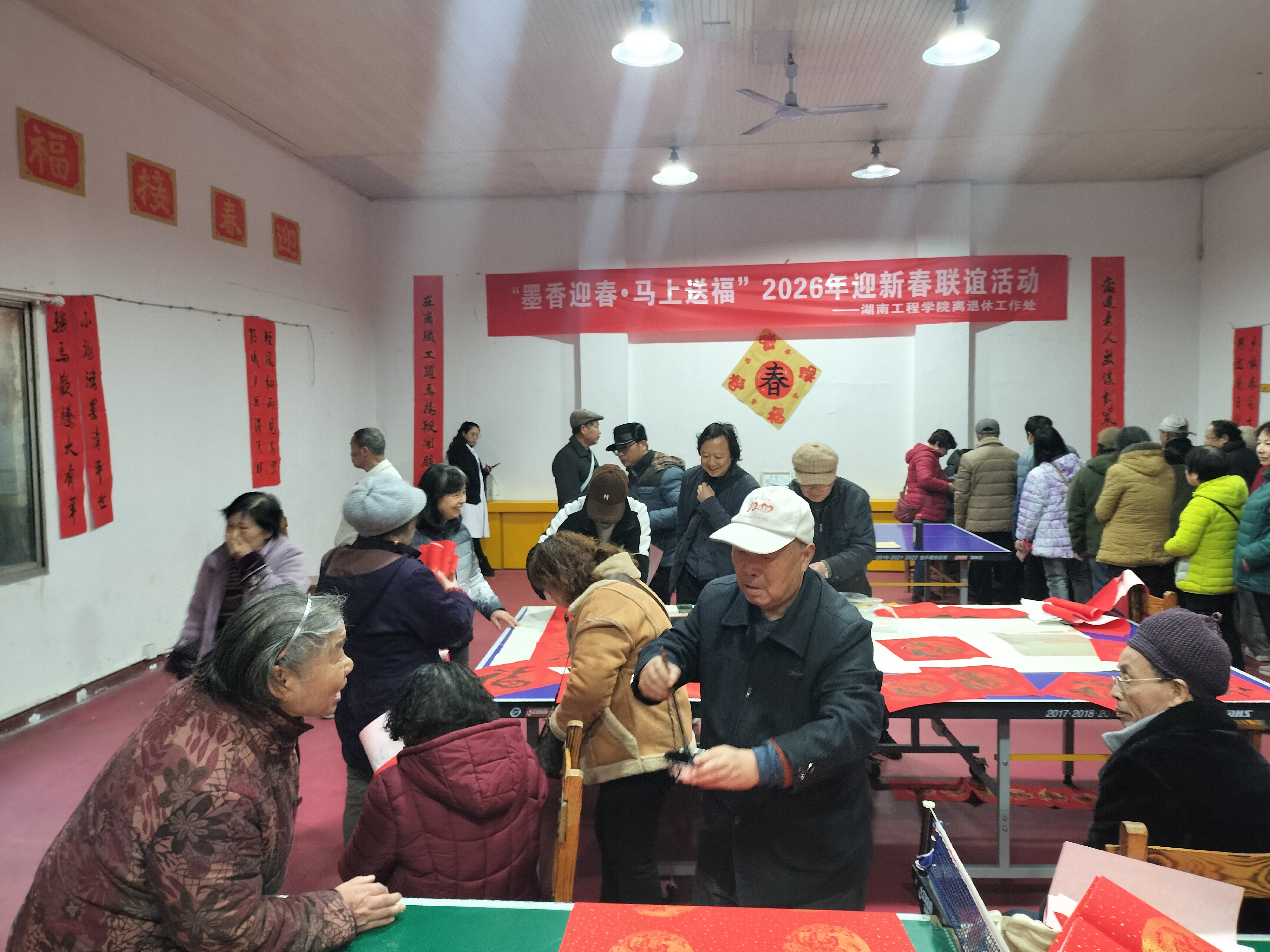 岁序更替,马年将至。1月14日上午冬日暖阳,湖南工程学院南、北两校区同步举办“墨香迎春,马上送福”2026年迎新春联谊活动,离退休老同志欢聚一堂,在笔墨书香与欢声笑语中迎接丙午马年,现场暖意融融、喜气盎然。